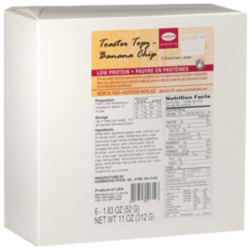 Description: Each package contains 6 - 52 g low protein Banana Chip Toaster Topz. These are good-for-you breakfast cakes, perfect for pick-up and go food or split, toasted and enjoyed with your favorite spread or butter.