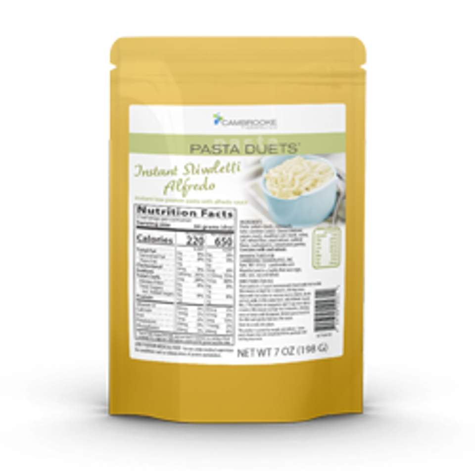 Preparation: Prepare Instant Stivaletti Alfredo in the microwave: Put macaroni in a 2 qt microwavable bowl with HOT tap water. Microwave on high for 3 minutes, stirring once. Rinse with hot water to remove excess starch, drain and set aside. In the same dish, add Alfredo sauce mix, 2 Tbs butter or margarine and 1 cup non-dairy creamer. Microwave on high for 3 minutes, stirring once or twice until saucy and thickened. Return pasta back to the dish and gently fold into the sauce.